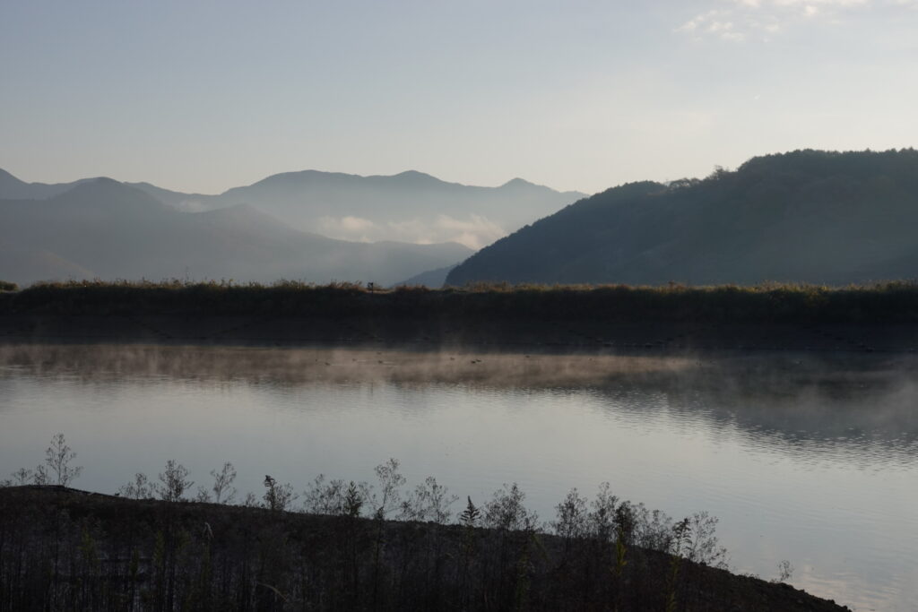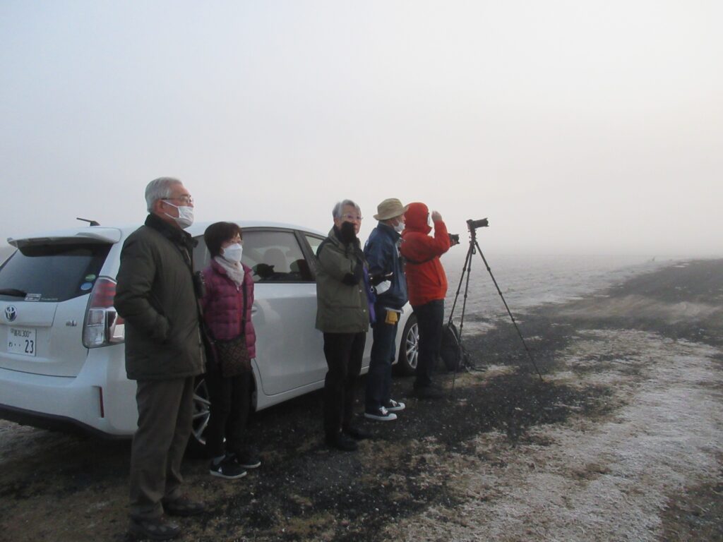 3日早朝は氷点下の寒さの中、ネグラから飛来するタイミングを田んぼで待ち受けました。空中からツルの鳴き声が聞こえ、一瞬その姿もかいま見えましたが、あいにくの濃霧で写真は撮れませんでした。