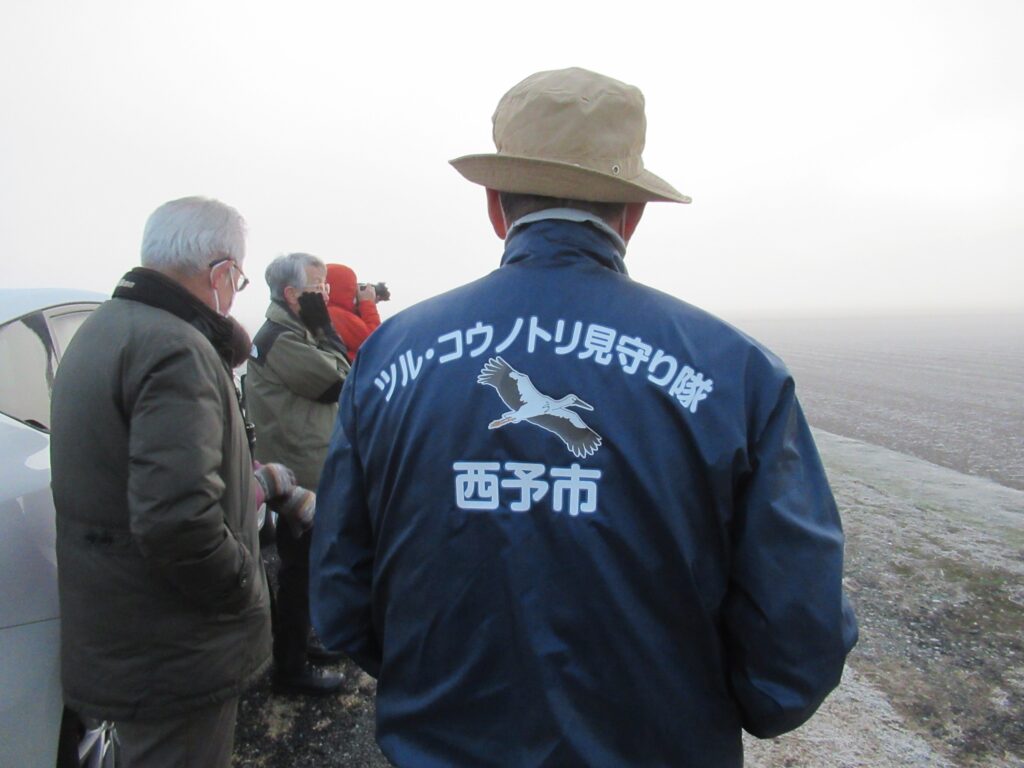今年もここで越冬するナベヅル、第一陣5羽が11月にやって来ました。私たちは西予市役所のツル担当者やツルを見守る地元のひとの協力のもと、西予市に移住した会員2名とともに2日間のフィールドワークを行いました。