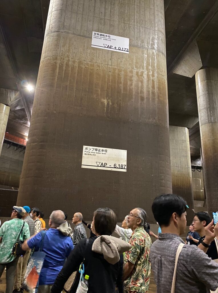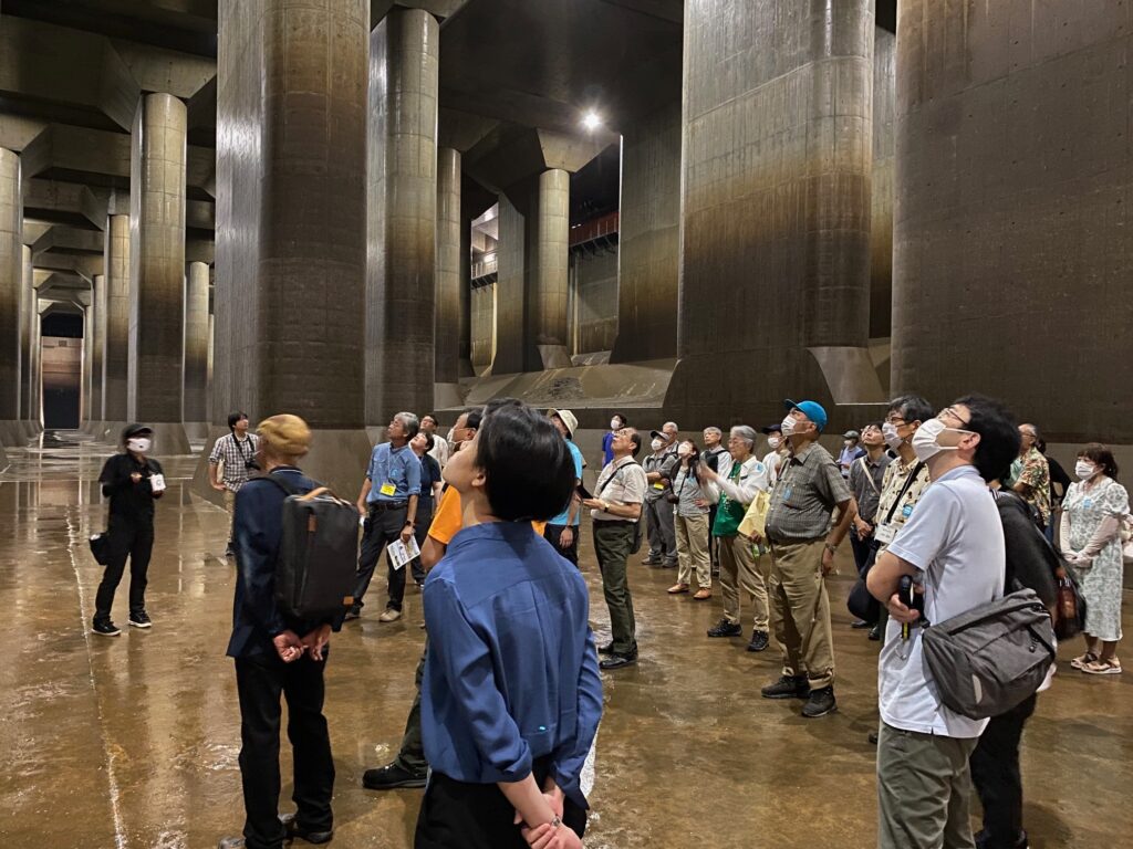 私たちは、水のトンネルが最後に江戸川への放水を行う排水機場、別名、防災地下神殿を見学しました。116段の階段を降りると、そこには巨大な水槽で、神殿にふさわしい光景が広がっていました。外気温34度に対して20度で、ひんやりしています。巨大なコンクリートの柱は、一本が約500トンで、全部で59本。新たな空間を周りの圧力から守るため必要とのこと。完成後の多量の降雨時、下流の中川・綾瀬川流域での浸水を軽減する大きな効果があがっているといいます。